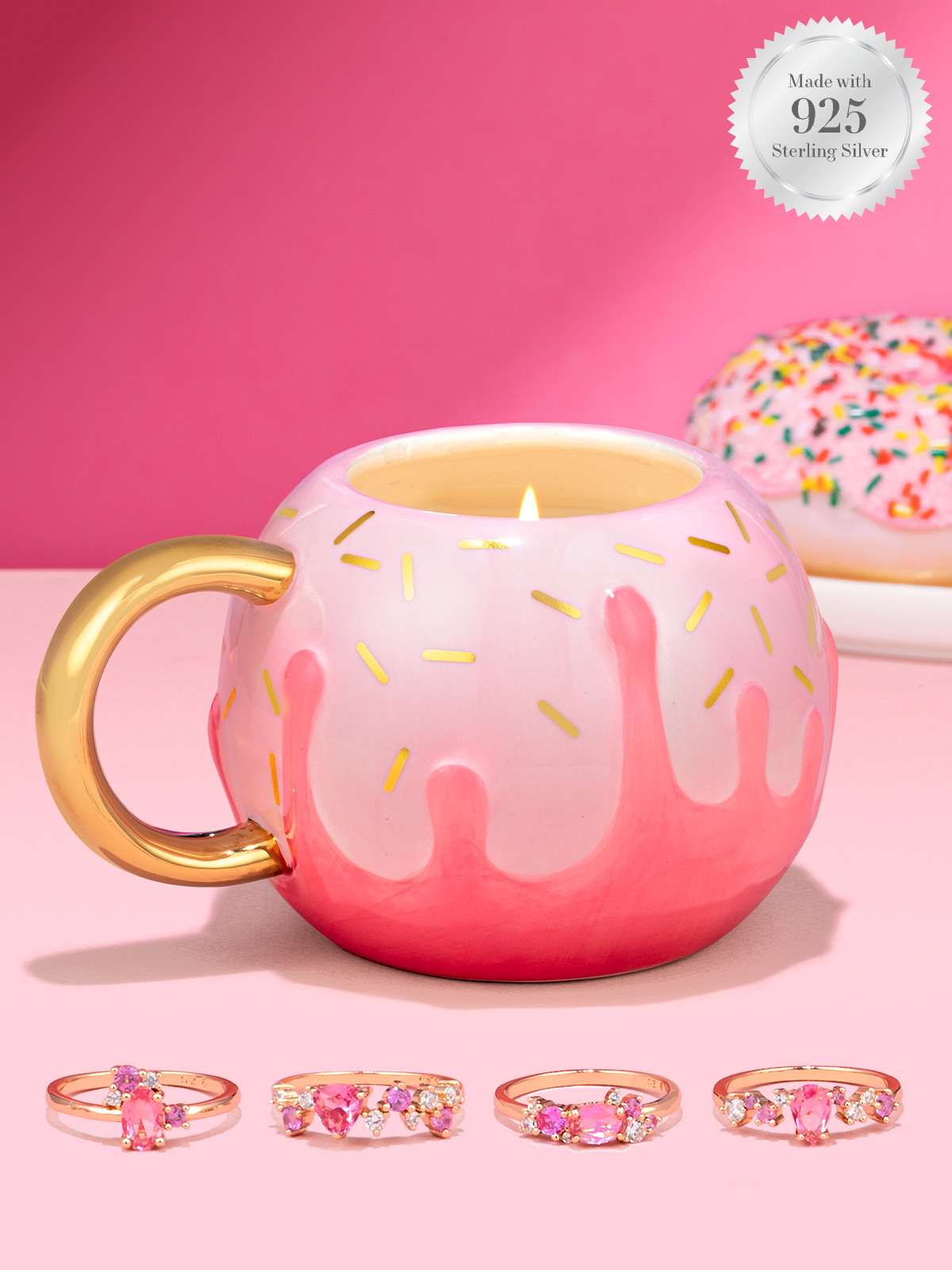 Strawberry Donut Mug Candle - 925 Sterling SIlver Pink & Rose Gold Ring Collection