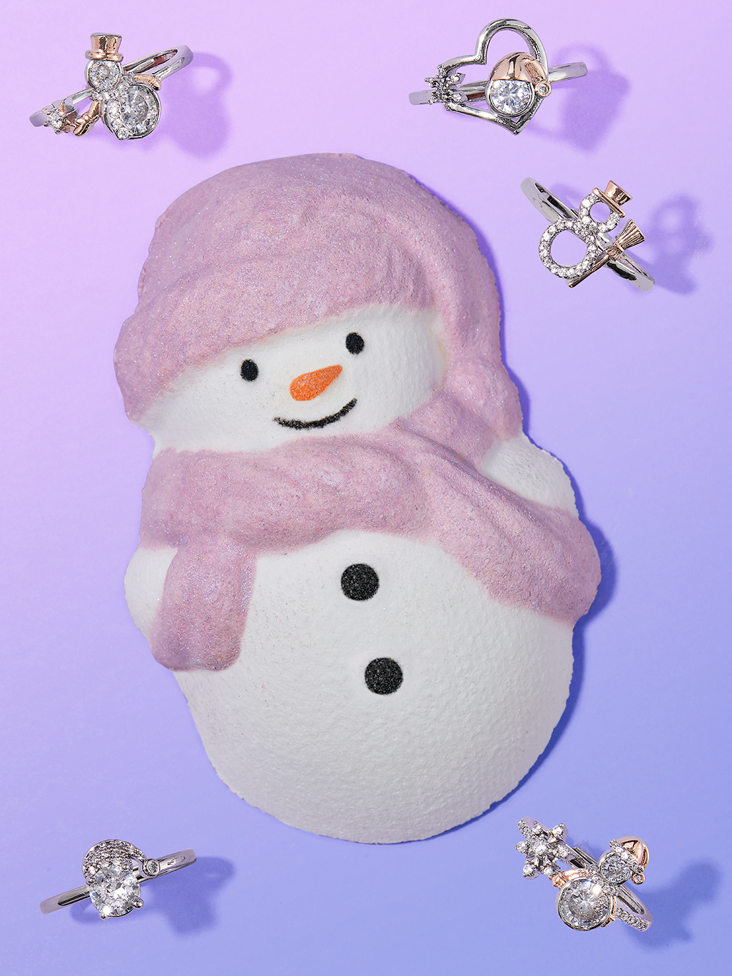 Find an adjustable, snowman ring made of rhodium plated metal inside this jewel bath bomb!
