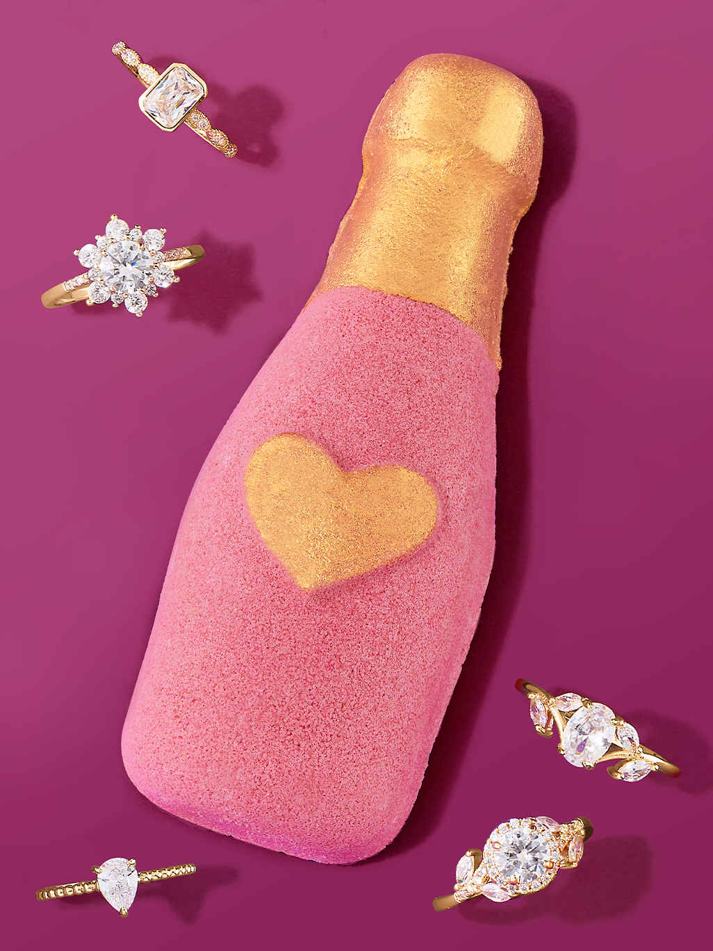 Say "cheers!" to this celebratory jewel bath bomb! Drop in the tub and watch the waters twinkle with biodegradable gold shimmer and burst with beautiful pink color!