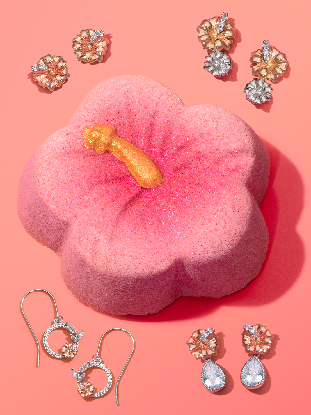 Find a pair of hibiscus earrings inside this jewel bath bomb! Earring posts made of solid 925 Sterling Silver. All earrings in this collection are two tone, finished in silver and 14K champagne gold.