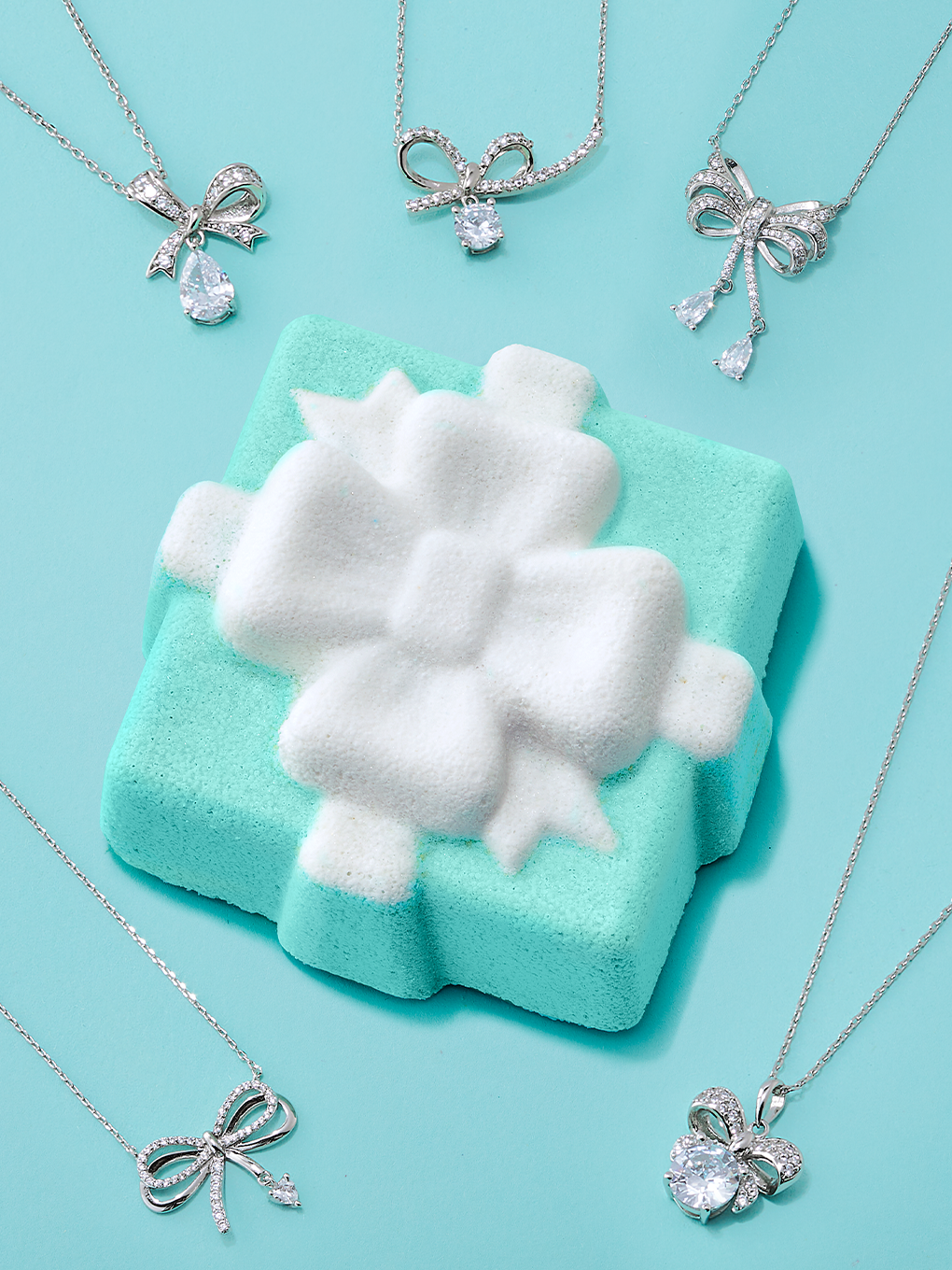 Find a bow necklace made of rhodium plated metal inside this jewel bath bomb!